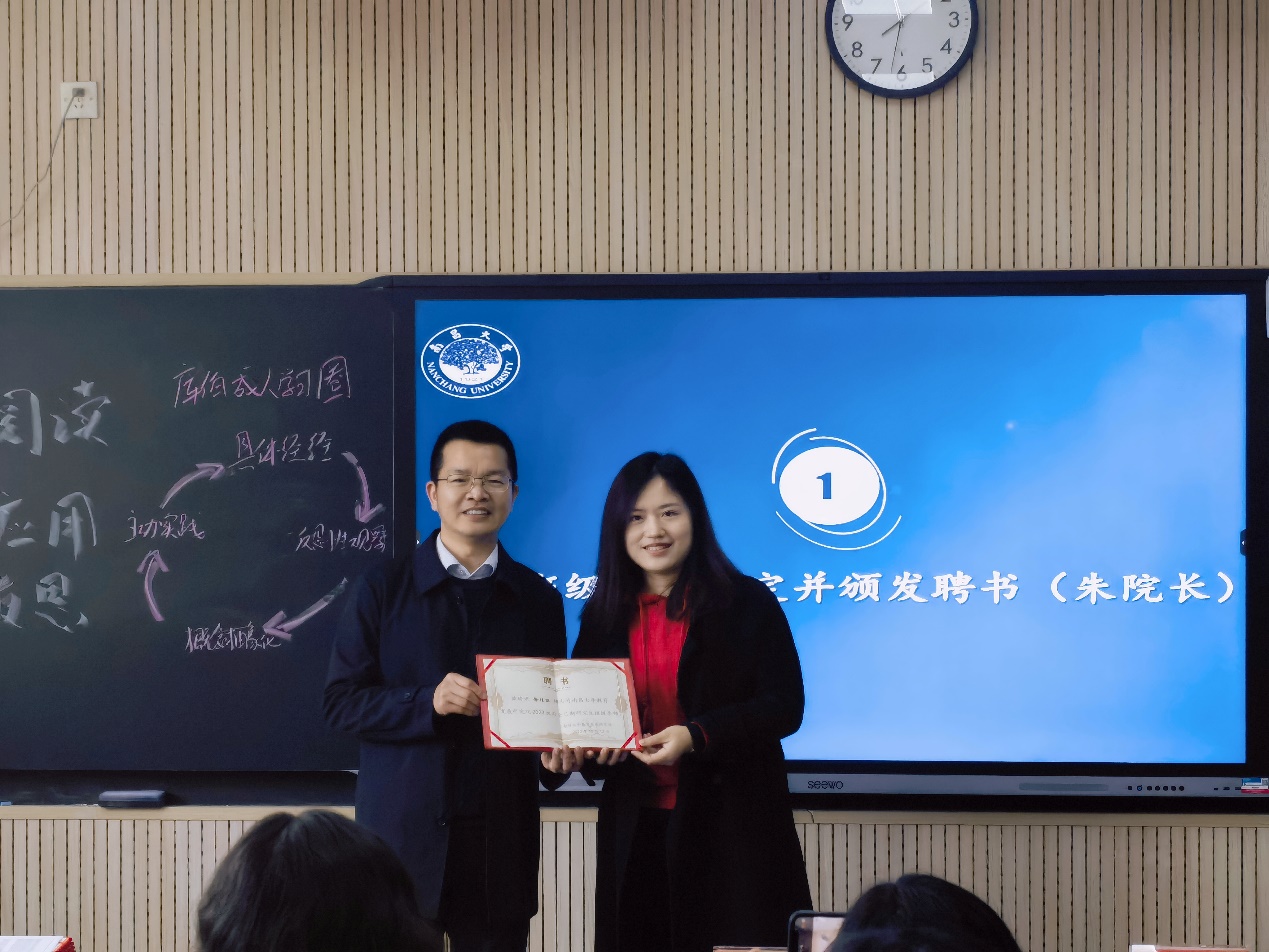 会议首先由朱旺力院长宣读班级导师聘任决定,聘任徐佳丽老师为班级导师。接着由苏君来老师宣读班委名单并给全体班委颁发证书。