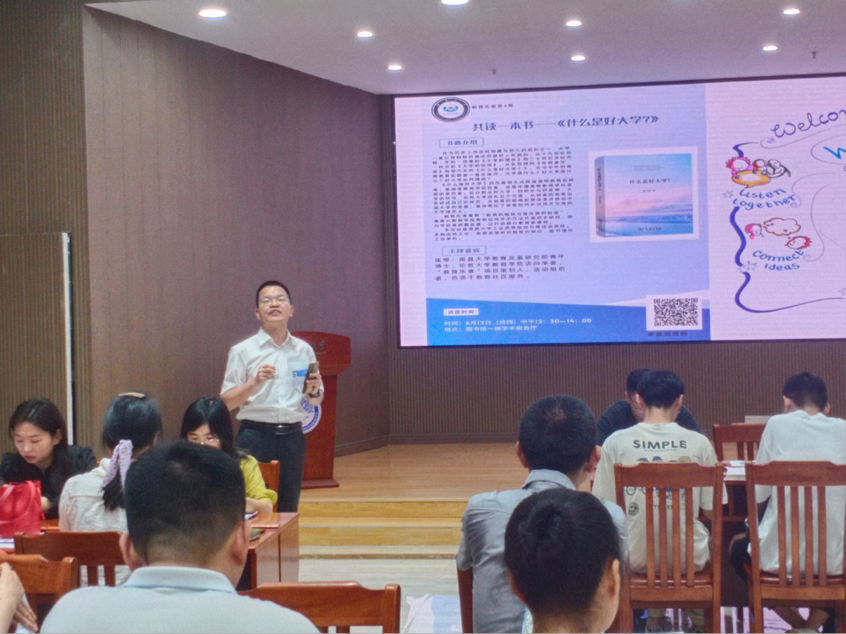 2024年6月13日中午12:30到13:50,思想引领项目“教育乐章”第四期在图书馆一楼学术报告厅进行,本期活动主题为“共读一本好书《什么是好大学》”,活动由校工会、教育发展研究院、图书馆联合举办。
